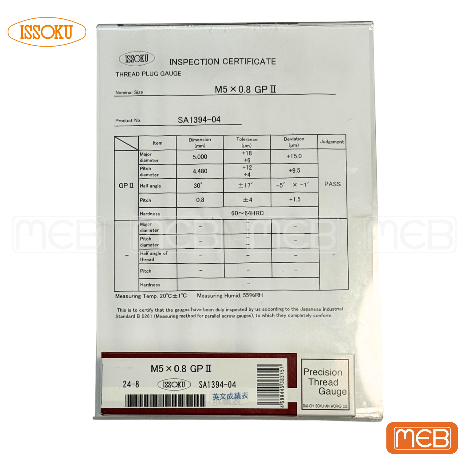 Dưỡng kiểm ren trục M5.0×0.8 GP II đến từ thương hiệu ISSOKU – Nhật Bản, được thiết kế để kiểm tra độ chính xác của ren ngoài theo chuẩn JIS B 0261, dùng phổ biến trong sản xuất cơ khí chính xác và lắp ráp linh kiện kỹ thuật cao.